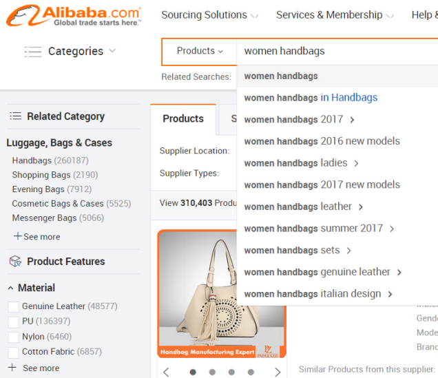 目前阿里巴巴國際站的搜索引擎,主要索引標(biāo)題、關(guān)鍵詞和產(chǎn)品屬性。阿里自2015年逐步引入買家偏好權(quán)重,我們可利用這一要素,在發(fā)布產(chǎn)品時(shí)利用屬性主動(dòng)去匹配買家偏好。舉個(gè)例子,在alibaba.com搜索women handbags這個(gè)關(guān)鍵詞,會(huì)有相關(guān)詞的推薦: