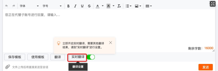 設(shè)置方法:詢盤詳情頁(yè)回復(fù)框下方可以開啟或關(guān)閉,點(diǎn)擊”實(shí)時(shí)翻譯“即可進(jìn)行設(shè)置接收語(yǔ)言