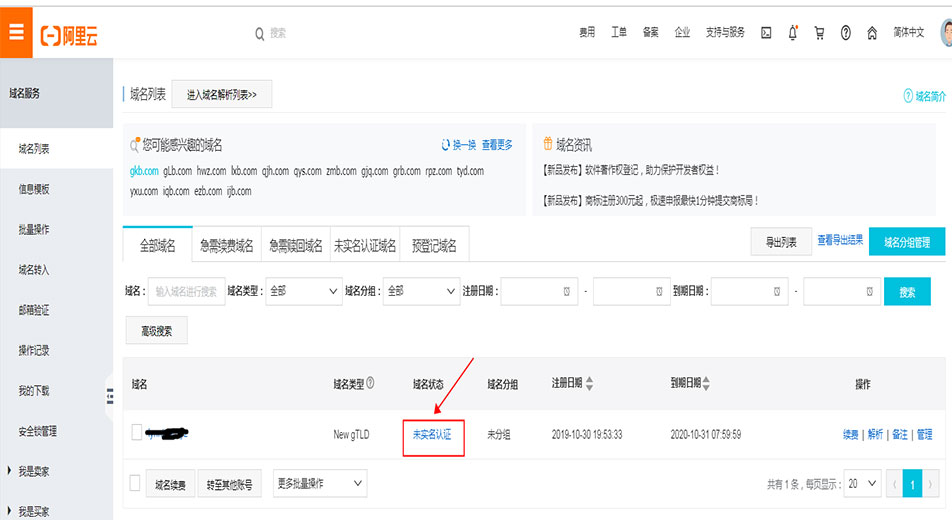 5)域名購買完成后需要進行實名認(rèn)證,并檢查域名狀態(tài)必須為“正?!?。